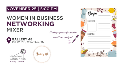 Maury Alliance hosts Women in Business Networking Events on the third Tuesday of every month to provide growth-minded women from all professional levels and backgrounds a friendly and welcoming environment where they can come together to share ideas and network.